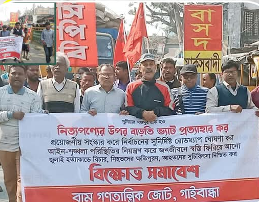 নিত্যপণ্যের উপর বাড়তি ভ্যাট প্রত্যাহার ও জানমালের নিরাপত্তা নিশ্চিত করার দাবিতে বাম গণতান্ত্রিক জোট গাইবান্ধা জেলা শাখার উদ্যোগে বিক্ষোভ মিছিল ও সমাবেশ অনুষ্ঠিত হয়। বুধবার (১৫ ডিসেম্বর) দুপুরে বিক্ষোভ মিছিলটি শহরের প্রধান প্রধান সড়ক প্রদক্ষিণ করে ১নং রেলগেটে এসে শেষ হয়।