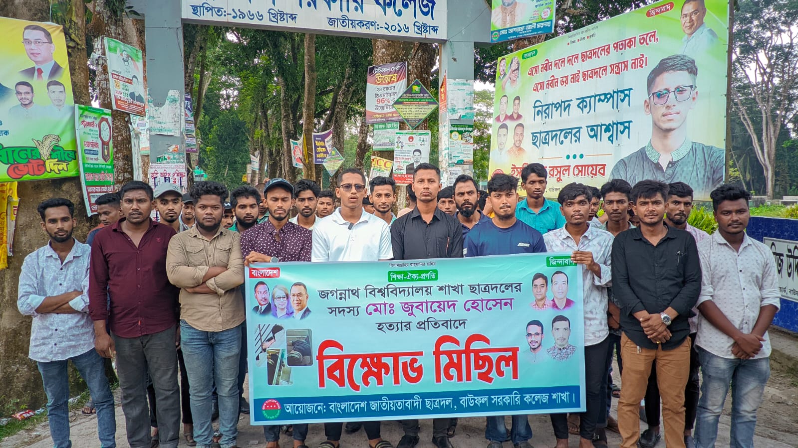 ঢাকায় জগন্নাথ বিশ্ববিদ্যালয় ছাত্রদলের সদস্য জোবায়েদ হোসেন হত্যার প্রতিবাদে বাউফলে বিক্ষোভ মিছিল
