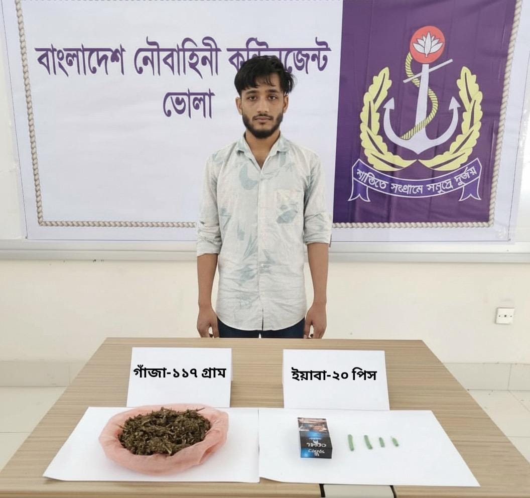 ভোলা সদর উপজেলায় নৌবাহিনীর বিশেষ অভিযানে মো. রাশেদ (২৮) নামের এক মাদক ব্যবসায়ীকে আটক করা হয়েছে। এ সময় তার কাছ থেকে ২০ পিস ইয়াবা ও ১১৭ গ্রাম গাঁজা উদ্ধার করা হয়।